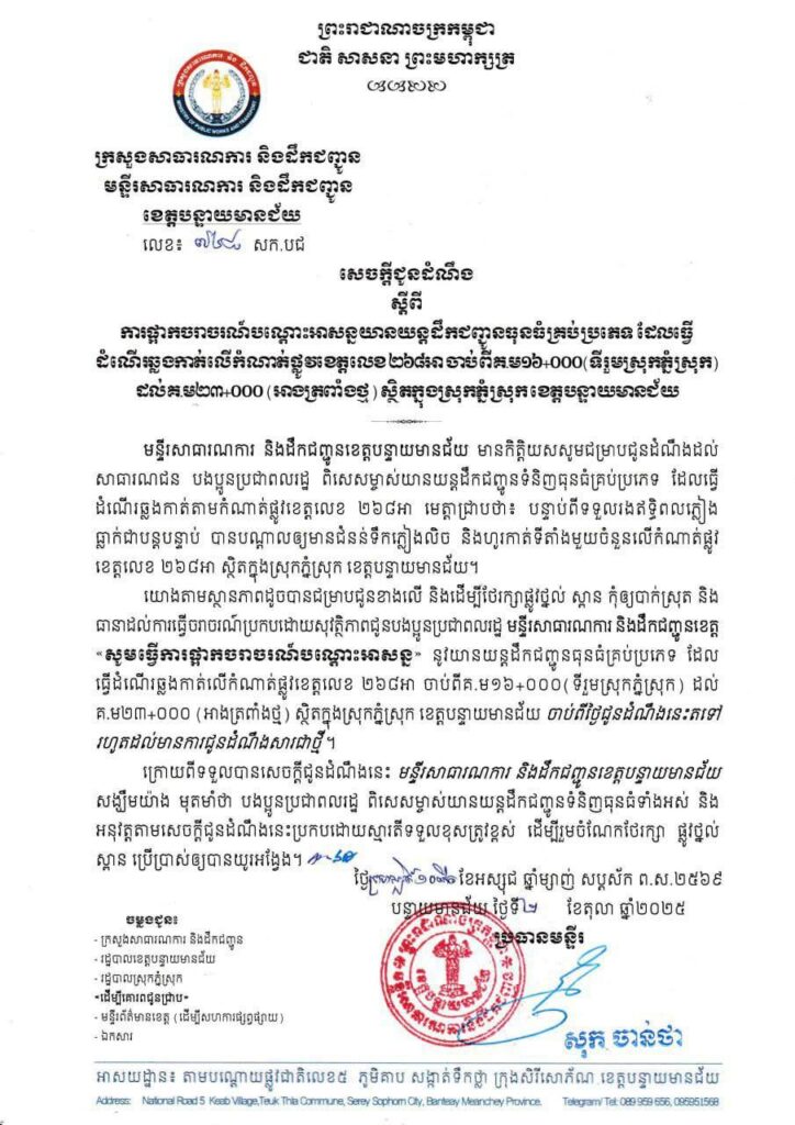 មន្ទីរសាធារណការ និងដឹកជញ្ជូន ខេត្តបន្ទាយមានជ័យ ប្រកាសផ្អាកចរាចរណ៍បណ្តោះអាសន្នយានយន្តដឹកជញ្ជូនធុនធំគ្រប់ប្រភេទ លើកំណាត់ផ្លូវខេត្តលេខ២៦៨អា